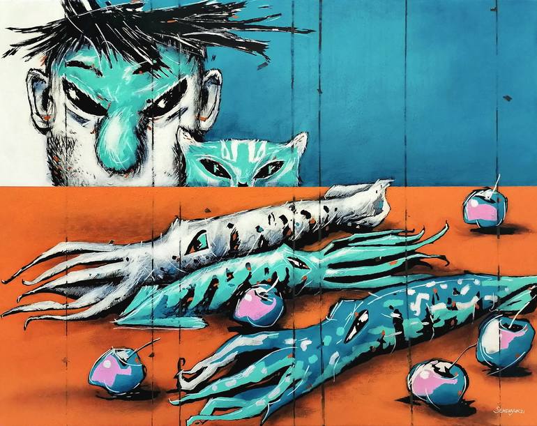 Squids and apples. 2021. Acrylic and oil on quality cotton canvas. 80 x 100 cm. Squids and apples - is an Original Figurative Acrylic and Oil Painting done on high-quality cotton canvas by Artist Semenyuk. It will be signed on the front and dated and the name will be on the back. This picture is sh...