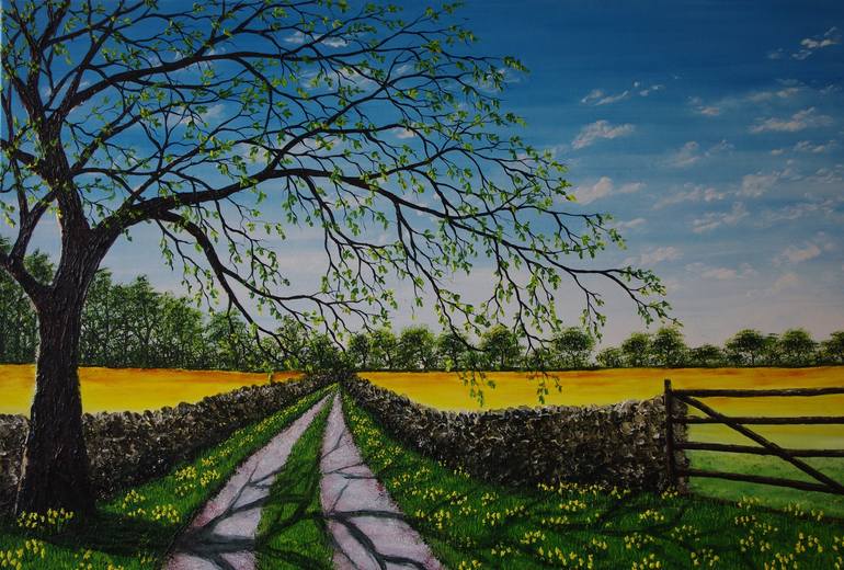 An impressionist oil painting of early morning walk down a country lane in wales. The oak tree is only just starting to form leaves, so there is bright light in this scene as its not covered by a thick canopy of leaves. Its the season of spring and the daffodils are in full bloom and you can see th...