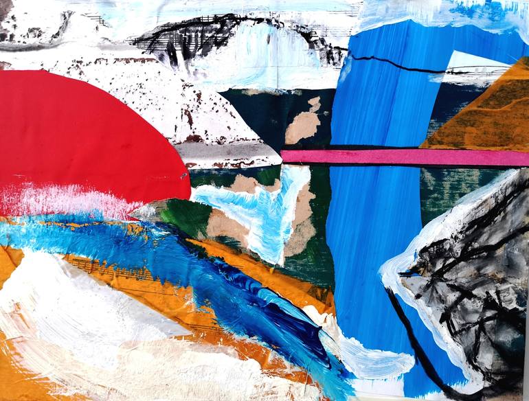 This is an abstract landscape painting and collage with drawing and is an abstraction of the St Ives Seascape and peninsula and is inspired by the work and style of Peter Lanyon. Painted on a residency at the St Ives School of Painting and is by the artist Nigel Waters.