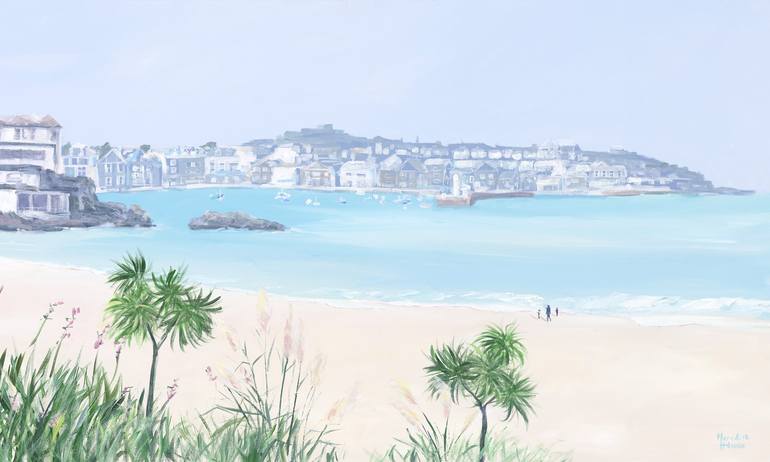 St Ives Cornwall by Meredith Howse is a large seascape inspired by the colours and beauty of St Ives. Clear luminous water surrounds St Ives when the tide is in. Coastal foliage sets the scene with three figures walking along the foreshore. Framed in light weight natural wood frame. This large artw...