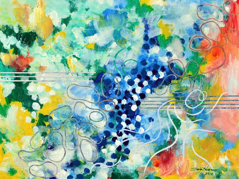 "St Thomas", acrylic enamels and paper on canvas, 24" wide by 18" tall (60 x 45 cm). This picture pays homage to the music of tenor saxophonist Sonny Rollins, and expecially to his great 1956 jazz instrumental of that title. The painting uses sign-painter's enamels: syrupy, vivid colors applied lav...
