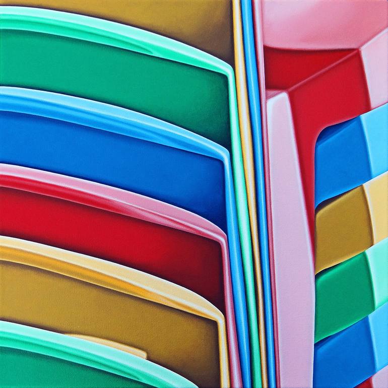 A very shallow pictorial space results from focusing closely on a small section of a group of six coloured stacked plastic chairs. This everyday subject-matter gives an opportunity to use variations of colour and shape for their own sake, so that what is depicted is not as important as the relations...