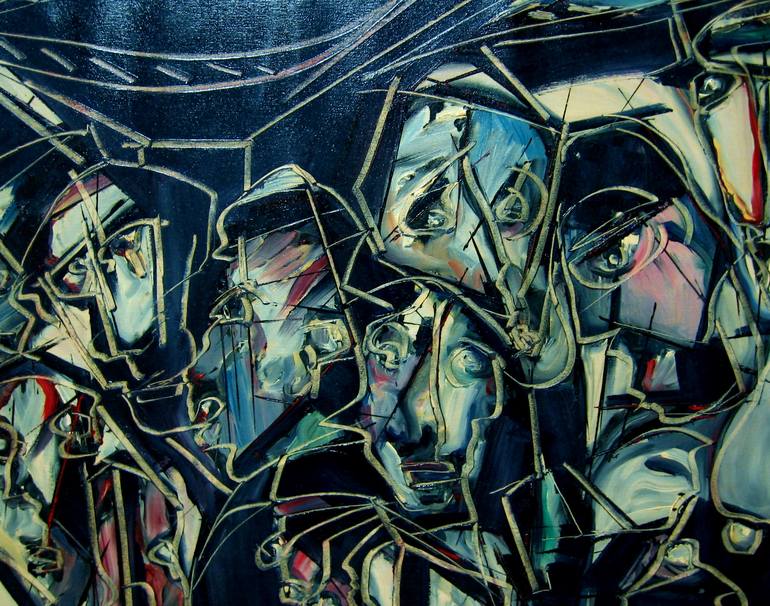City crowds in a stadium clashing to see the game. Tried to capture the frenzy of the crowd in a stadium. The euphoria and the excitement of the crowd coming in waves of sound. Done in an expressionistic, semi-abstract style. Oil on canvas (stretched).