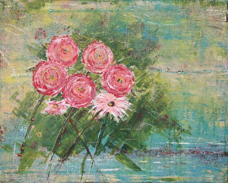 I am always inspired by flowers of all kinds. Pinks and greens are my personal favorites. Jumping back into painting after a life-changing event is what inspired the title of this particular piece. It is a message to myself. A brayer, fork, feather, credit card and my fingers were the "tools" used f...