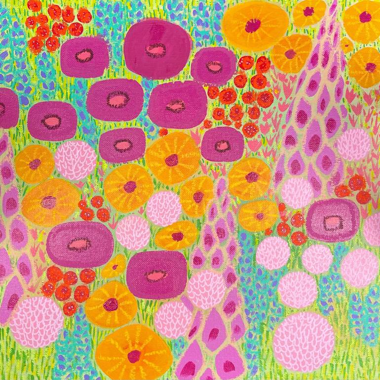 Painted on a 30x30cm canvas panel. My practice sees me working across painting, printmaking, pastels and collage to create fantasy floral worlds and landscapes abstracted from the real world. I play with size and shape to create bold works often with a strong sense of colour and pattern that refere...