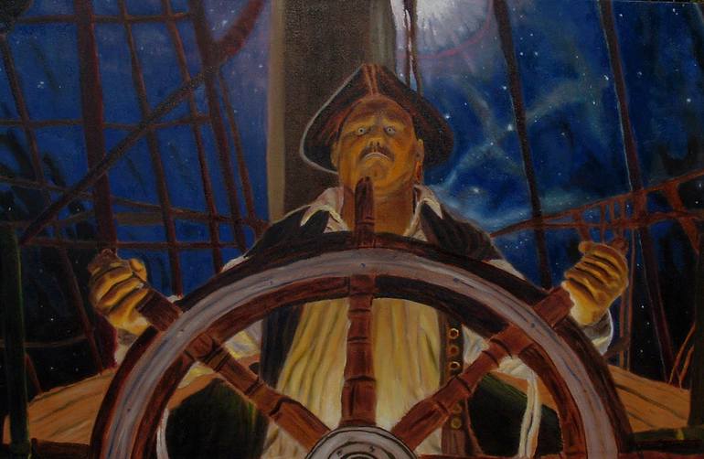 A Star Pirate captain is at the helm of his ship sailing the cosmic sea.