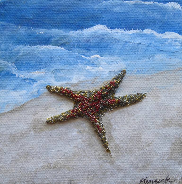I always liked finding these interesting creature while walking at the waters edge. I used metal beads to add texture and dimension. The piece is painted on the sides, so no frame is needed. It's ready to hang. My hope for the viewer is to invoke their memories of happy, whimsical days.