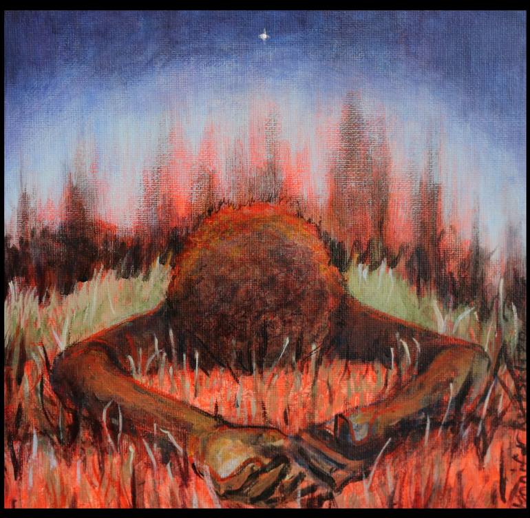 The figure is lying in the grass, under a sky just after the sun sets. The North Star is overhead. Trees, buildings, or unclear forms are in the distance.