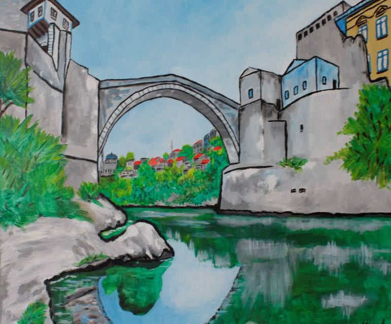I painted a historical and world heritage bridge in an abstract and cubist style. The sides of the picture were painted with white. It is ready to hang in this condition.