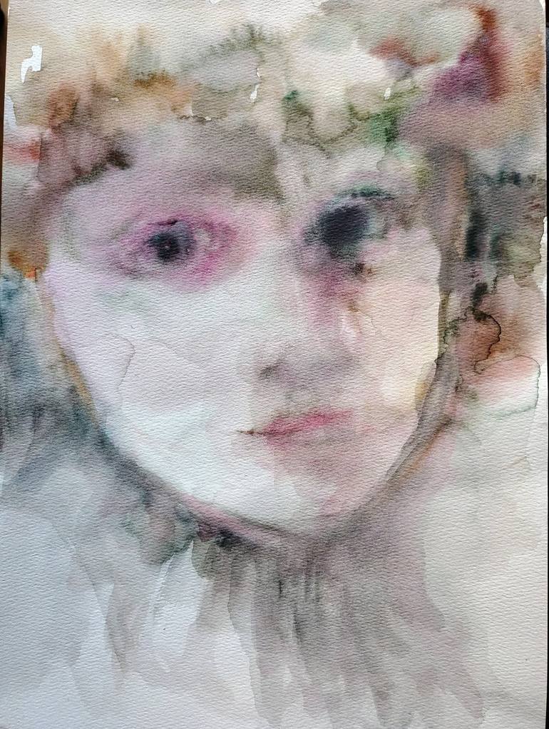 "Staring" is a captivating original watercolor painting on paper, showcasing a boy's face in an expressive portrait. The artist masterfully employs the watercolor technique to bring forth the nuances of light and shadow, adding depth and emotion to the piece. This figurative artwork, rendered in an...