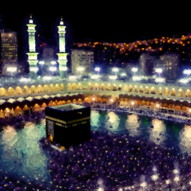 "Starry Night: The Sacred Kaaba Painting" could be a piece of art depicting the Kaaba, the sacred building at the center of the Masjid al-Haram mosque in Mecca, Saudi Arabia. The painting might show the Kaaba illuminated against a night sky filled with stars, capturing the spiritual and mystical ess...
