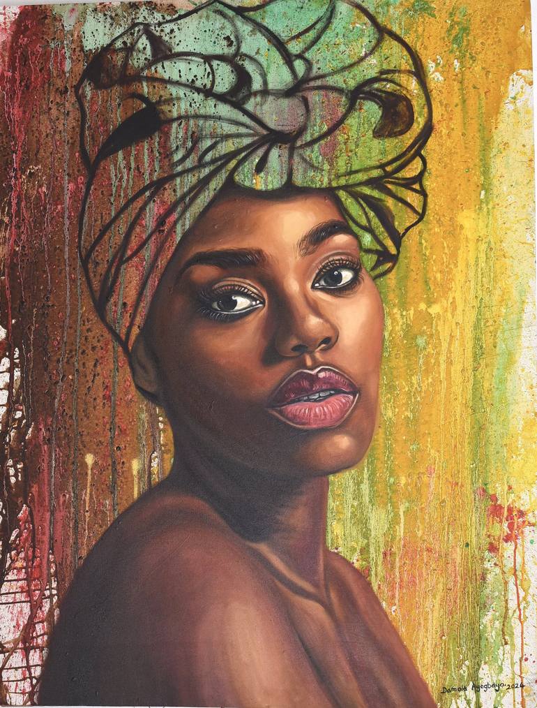 Damola Ayegbayo is an acclaimed visual artist, celebrated for his mastery in paintings and drawings that deeply reflect his personal heritage and cultural narratives. Born in 1988 in Ejigbo, Osun State, Nigeria, Damola pursued his passion for art at Obafemi Awolowo University, earning a Bachelor’s degree in Fine and Applied Arts. Damola’s art has gained international attention and acclaim. Notably, his work was commissioned for the 2023 film adaptation of “The Color Purple.” He also gained recognition in the world of digital art, being the only African artist featured in the World of Women NFT projects, collaborating with prominent platforms such as OpenSea and Saatchi Art. Damola has exhibited his work globally, including in Nigeria, the US, the UK, Canada, and Europe. His paintings have been auctioned by renowned houses like Jasper52, LiveAuctioneers, and Bidhaus, and have found homes with private collectors such as Marcus Gardley, Jimmy Akingbola, and Lisane Basquiat. In 2022, his piece “Unconditional Love 2” was featured on the cover of HarperCollins Publishers’ “Relations: An Anthology of African and Diaspora Voices.” His work “Purpose of Existence” was used in a campaign by Cambridge University Press to promote black women’s mental health. In 2023, his artwork “Vision of Hope” was highlighted in Jimmy Akingbola’s documentary “HANDLE WITH CARE.” The name of my painting style is called ÀBÈFÉ meaning ( pleaded to be loved) which is my native name. my craft is an expressionism style of art, I use portraits of beautiful black women to speak to society about morals, good behavior, love, and unity. an image of a black beautiful woman always reminds me of how my strong mother trained and brought me up with love and good morals helping me to discover my real self, the concept of using a black woman is a great reference to my loving mother and the role Other women had played in my life, their importance and existence in the world can not be underestimated. He is inspired by his late grandfather that was a painter, sculptor, and ceramist from a tender age, as his love to practice art increased in the university by meeting with greater like minds in the department and visits many art galleries and art departments in other universities, also traveled to historic ancient cities and art workshop etc..