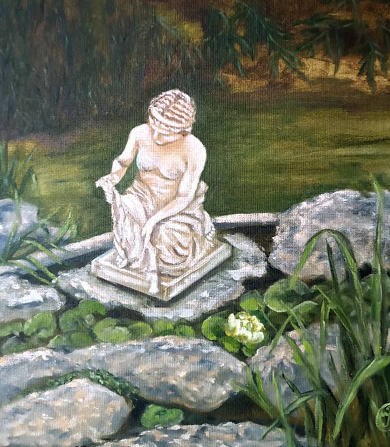 The painting depicts a white marble statue of a girl rinsing cloth in a lake. The painting is painted with oil paints on canvas stretched on cardboard. This painting can be framed to your liking or placed on a shelf without a frame.