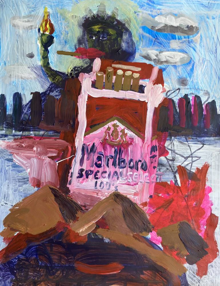 Acrylic on paper painting of the statue of liberty smoking a cig.