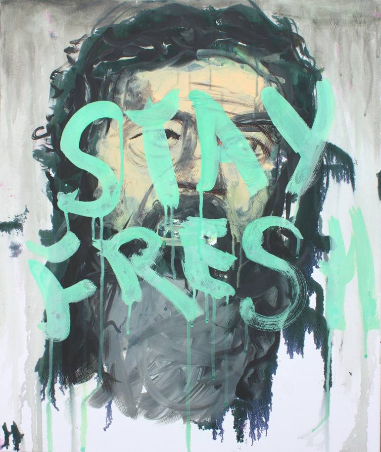 A portrait of a bearded Saddam Hussein that looks a bit like Jesus. On Canvas.