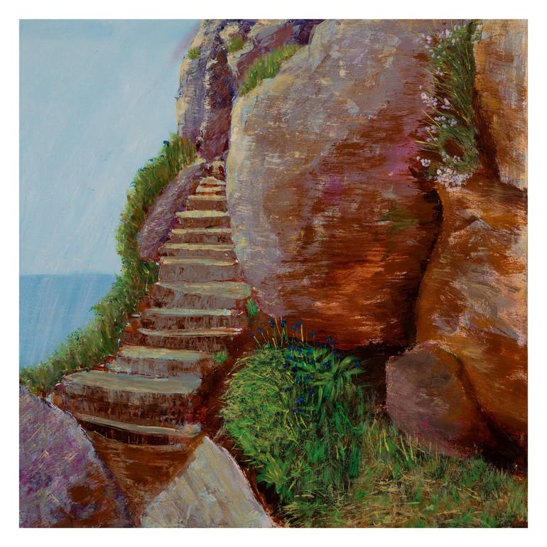Steps from Porthcurno Beach Cornwall up towards the Minack Theatre. The Granite rocks in Porthcurno have an impressive and beautiful quality to them which inspired this painting. The Granite sand gives the beach a unique quality. As well as being a historic beach this place can only get so busy and ...