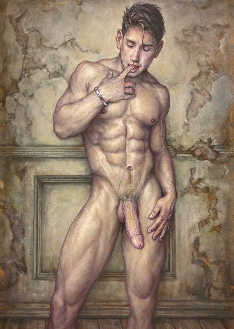 This oil painting of a standing male nude is inspired by ancient Greek athletes and Roman bronze statues.