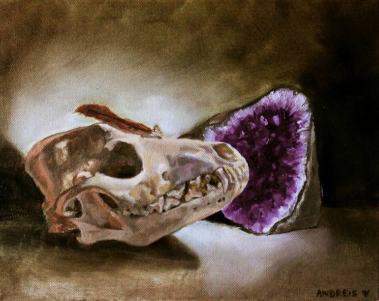 Still life with Coyote skull, feather and Amethyste
