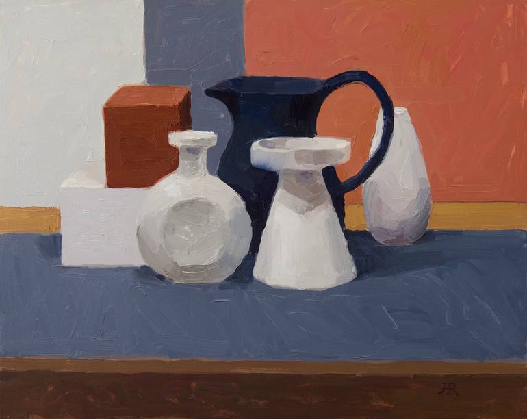 Oil on canvas board. This is an ongoing series of still lifes.. These static and subdued paintings are meditations on the harmonious unity of contemporary conflicting individualities. My work on still lifes begins by browsing antique shops and thrift stores. Out of the vast array of objects, I loo...