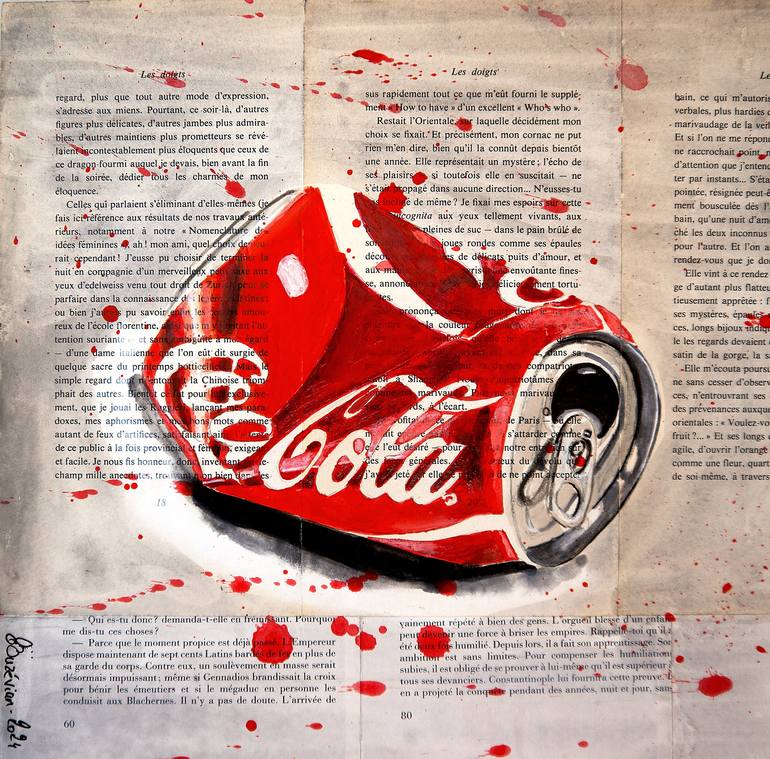 ⭐Coke Starwars ⭐ Smashed Coca Cola with red drippings Technique: oil, acrylic, and ink on old book pages on wooden frame 30x30cm ■■ 11,8x11,8 inch ⭐Sustainability⭐: Wooden frame is made by the artist by recycling old books. In an ecological approach, each packaging is tailor-made and is itself fr...