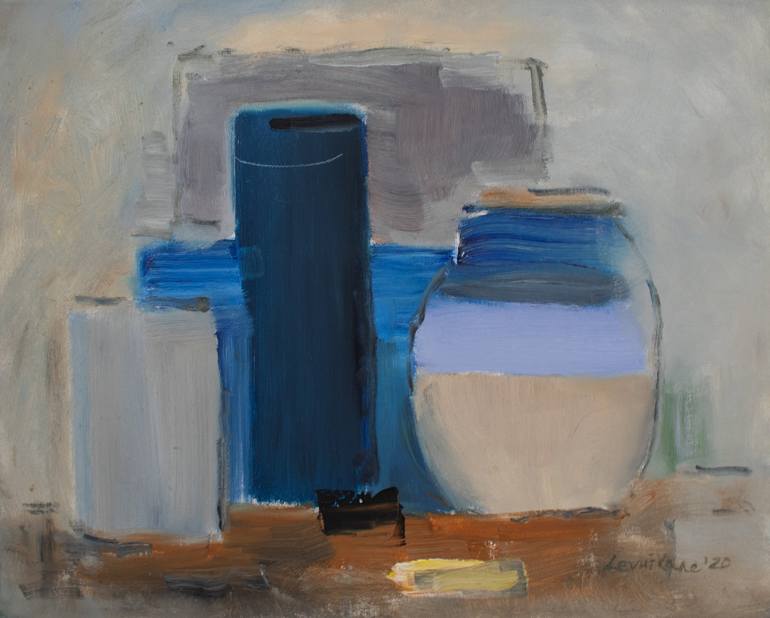 Created in a single, uninterrupted burst, this minimal still life showcases two simplified containers: a tall column of deep cobalt and a round pot wrapped in airy white-and-sky-blue stripes. Their bold hues leap out against a muted backdrop of taupe and soft gray, where wet strokes blur gently into...