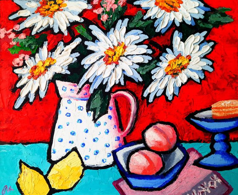 Textured still Life. The smell of sweet childhood. Daisies in a wase. Bright positive still life with a bouquet of daisies and fruit was painted under the influence of sweet memories from distant childhood. Naive style of writing this painting allowed to deeply feel the warm atmosphere of home comfo...