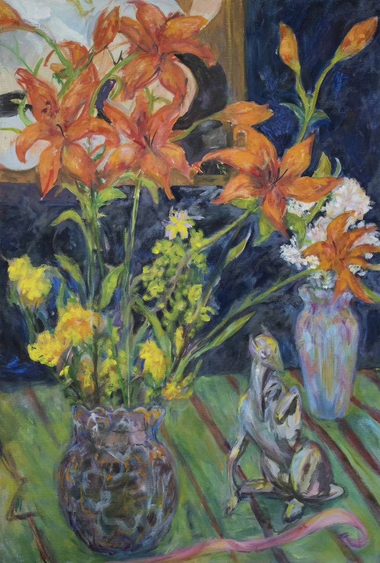 This painting is one of my series of still lifes incorporating flowers with personal objects that I've collected.