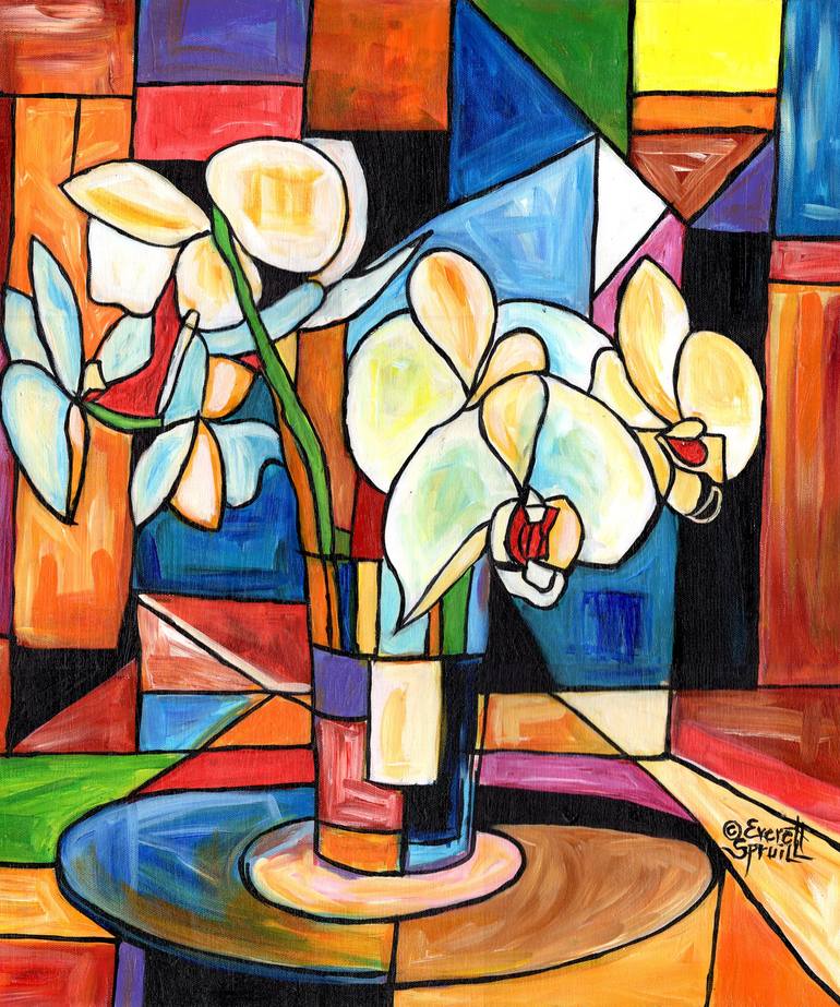20 x 24" still life painting of white orchids in a cubist motif by Everett Spruill