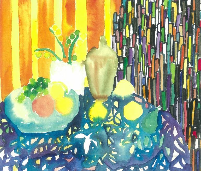 This work was inspired by the play of light, colour, and patterns between the stained glass window, the shapes of fruits, and the fabric on the table.