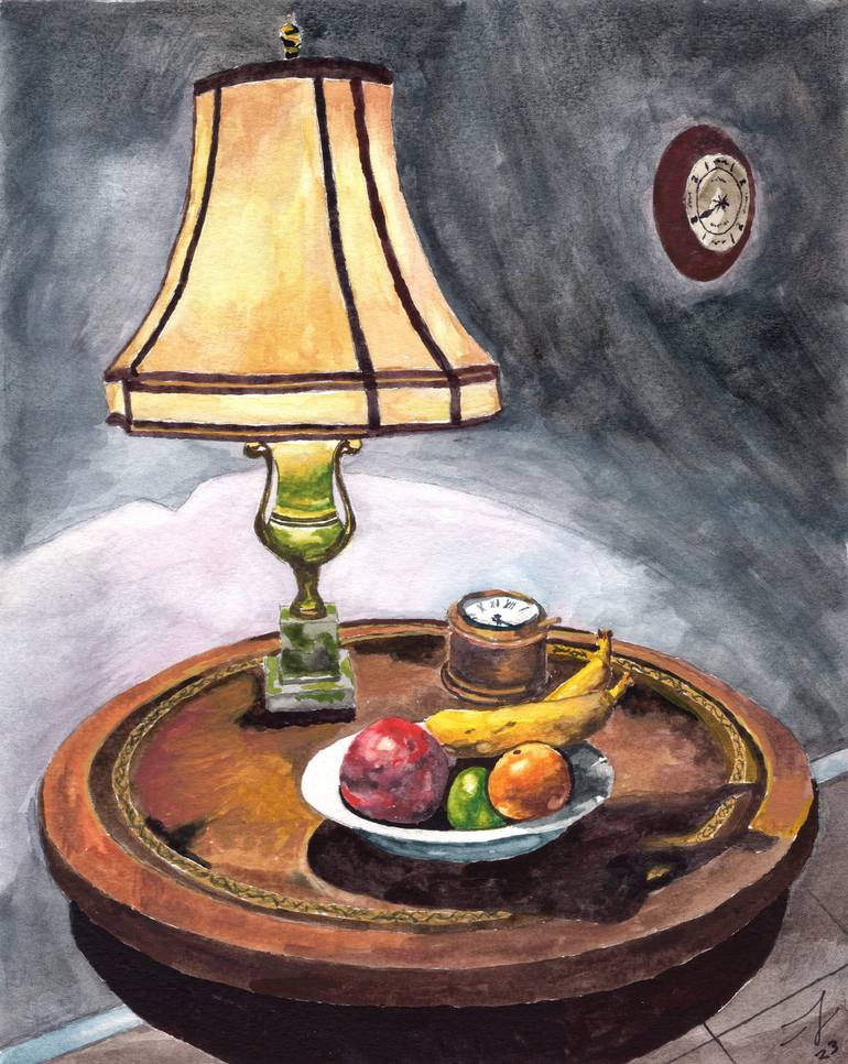 A favorite antique green onyx lamp with silk shade shines over an antique clock and a bowl of pomegranate, lime, clementine, and bananas. The base is a lovely old Duncan Phife table with an inlaid leather top. A tide clock on the wall completes the picture. There is such vibrant color and energy...