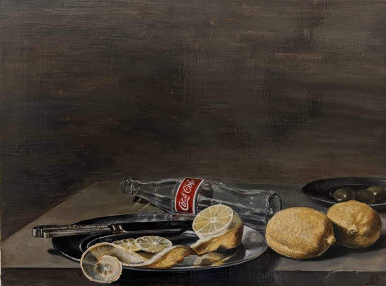 Still Life with Two Lemons, a Coca-Cola Bottle, Knife and Olives on a Table. My interpretation of Pieter Claesz's work (1629). Oil on canvas. 16x12.