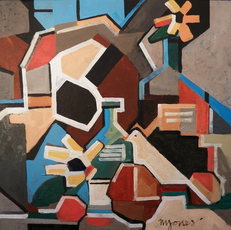 "Still Life with a Guitar" is an original 24 x 24" acrylic painting by Micheal W. Jones. This striking cubist painting was created from life, using the finest pigments on stretched canvas. It will be carefully packaged and delivered to your door. As usual, you pay only actual shipping costs
