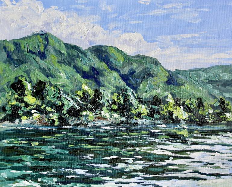 In crafting this piece, I was inspired by the serene yet vibrant energy of nature. My brush strokes capture the lively essence and tranquility of the landscape, reflecting the interplay of light across the water and the lush green of the hills. The impressionistic style allows for a dance of colors ...