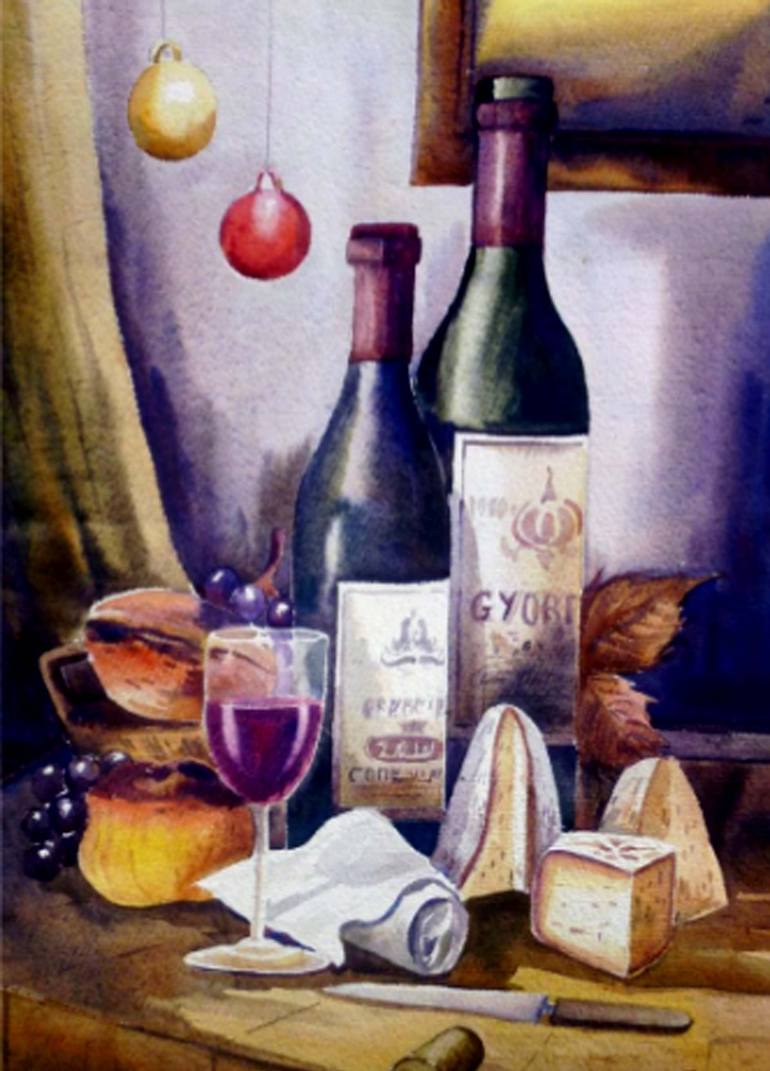 Wine Bottles, Wine Glass & Food is a large Watercolor Painting