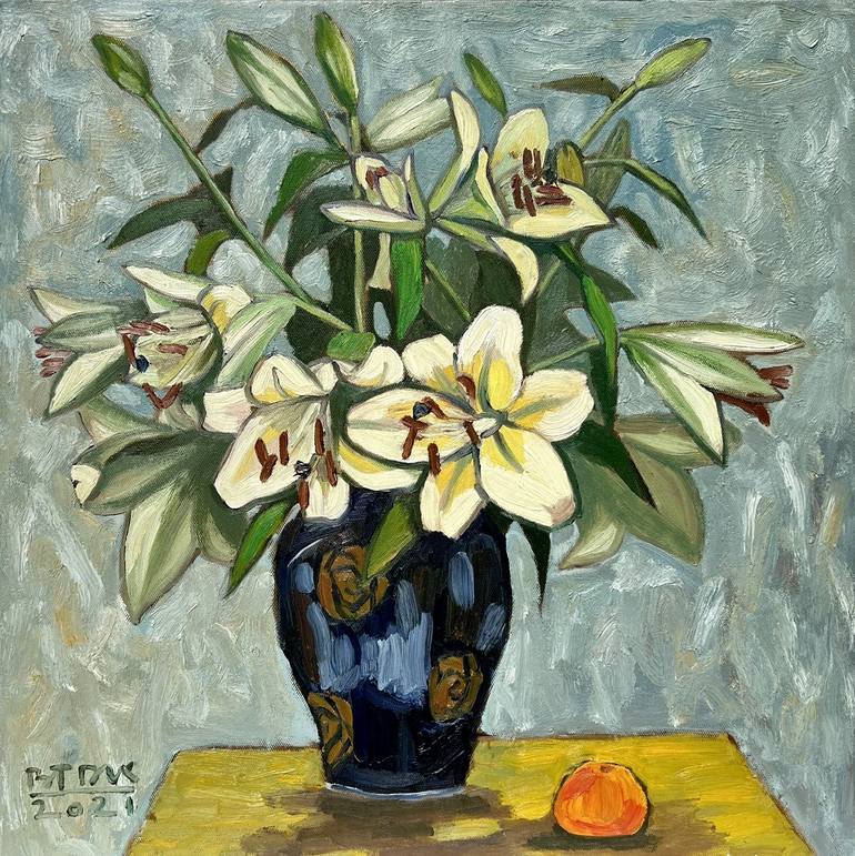 This is an oil painting on fabric, size: 60X60cm, 3cm thick, using the multi-layer oil painting technique. Spring is the season when hundreds of flowers bloom. The lily is not as brilliant as the peach and apricot blossoms but has a noble and noble character, symbolizing beauty, dignity, pride, and ...