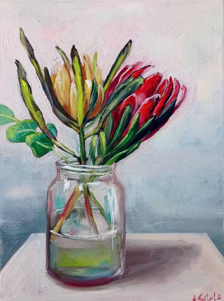 Still life with Proteas Inspired by beautiful flowers from a local florist. Please feel free to contact me to order a similar painting in another size. Certificate of Authenticity included.