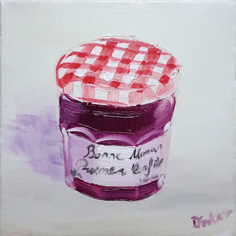 The painting shows a still life with a small glass jar of cherry jam. Can be a good decor for the kitchen or a dinning room