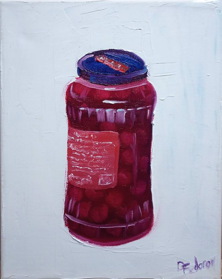 The painting shows a Still life with cherries in a glass jar. Can be a good decor for the kitchen or a dinning room