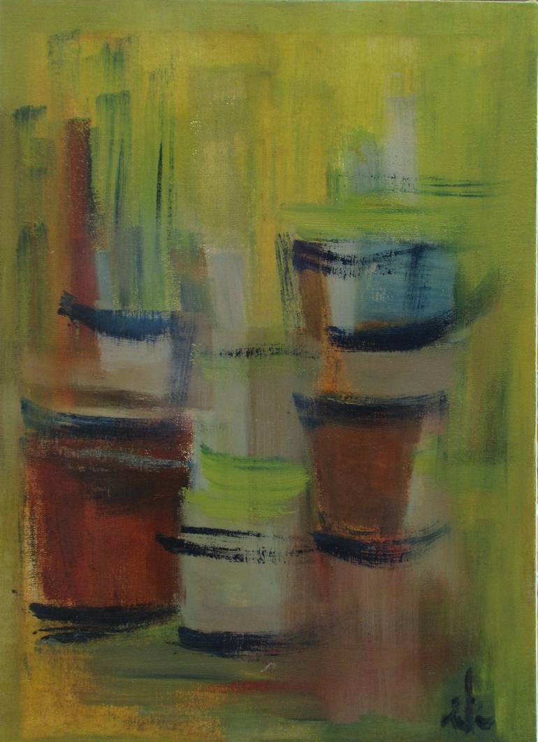 During the winter I left my empty flower pots outside on the balcony. My daily view leaded me to paint those pots on canvas, wrapped over an empty object-frame. For my painting I used the colors of the flowers I plan to put in later.