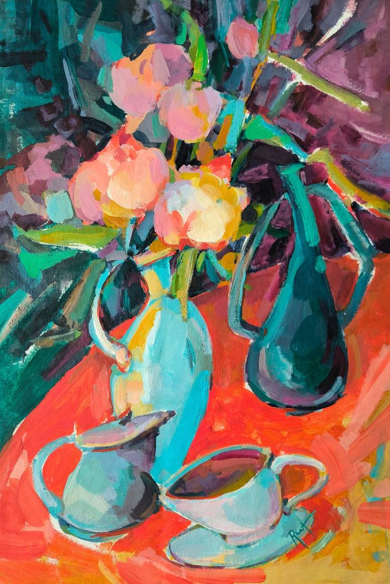 “Evening tea” - modern art original acrylic painting. 60х40х2 cm. 23,6"х15,7"х0,8" acrylic on canvas. "Evening Tea" is a painting permeated with soft light and the aroma of a summer garden. Lush flowers in a vase seem to whisper stories of quiet evenings, and a cup of tea standing nearby invites yo...