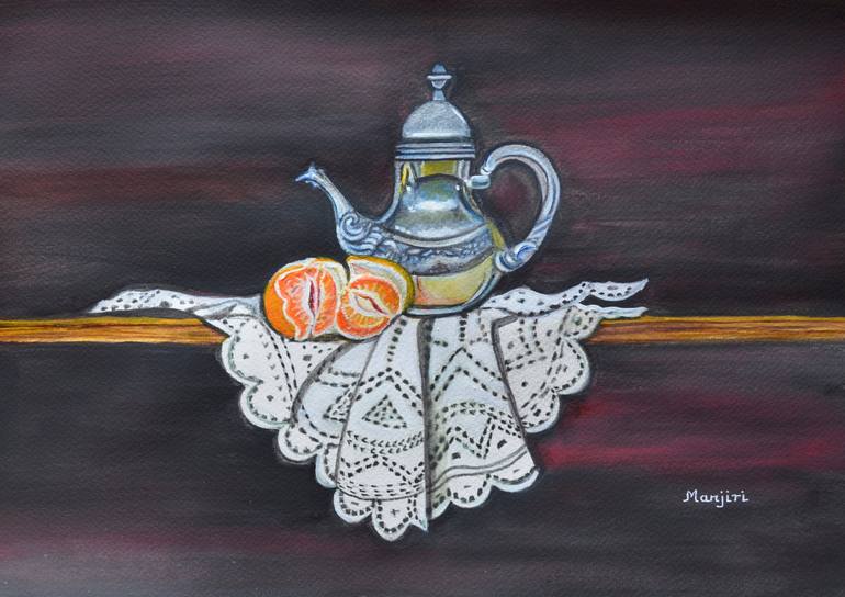 A unique still life with oranges and a silver tea pot arranged on a lace table cover. Medium: Acrylic and Gouache on watercolor paper Size: A3 (16.5 x 12 inches) This painting will look beautiful in any frame. Certificate of Authenticity and Tracking number will be provided.