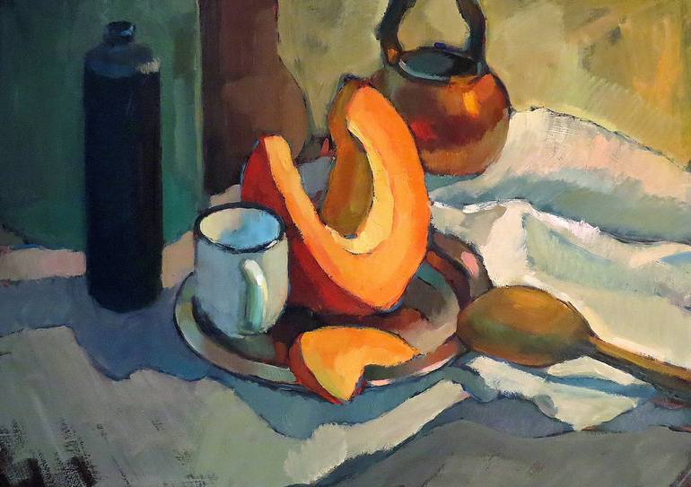 Academic realistic etude painting still life with pumpkin on a metal tray, copper kettle and ceramic bottle.. Painting is made in the traditions of Russian realistic school.