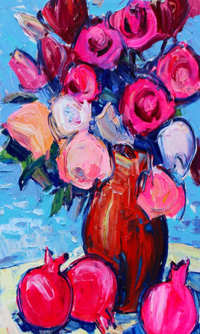 Still life with roses and pomegranate near the sea. This picture will decorate your interior as well as add to your collection.