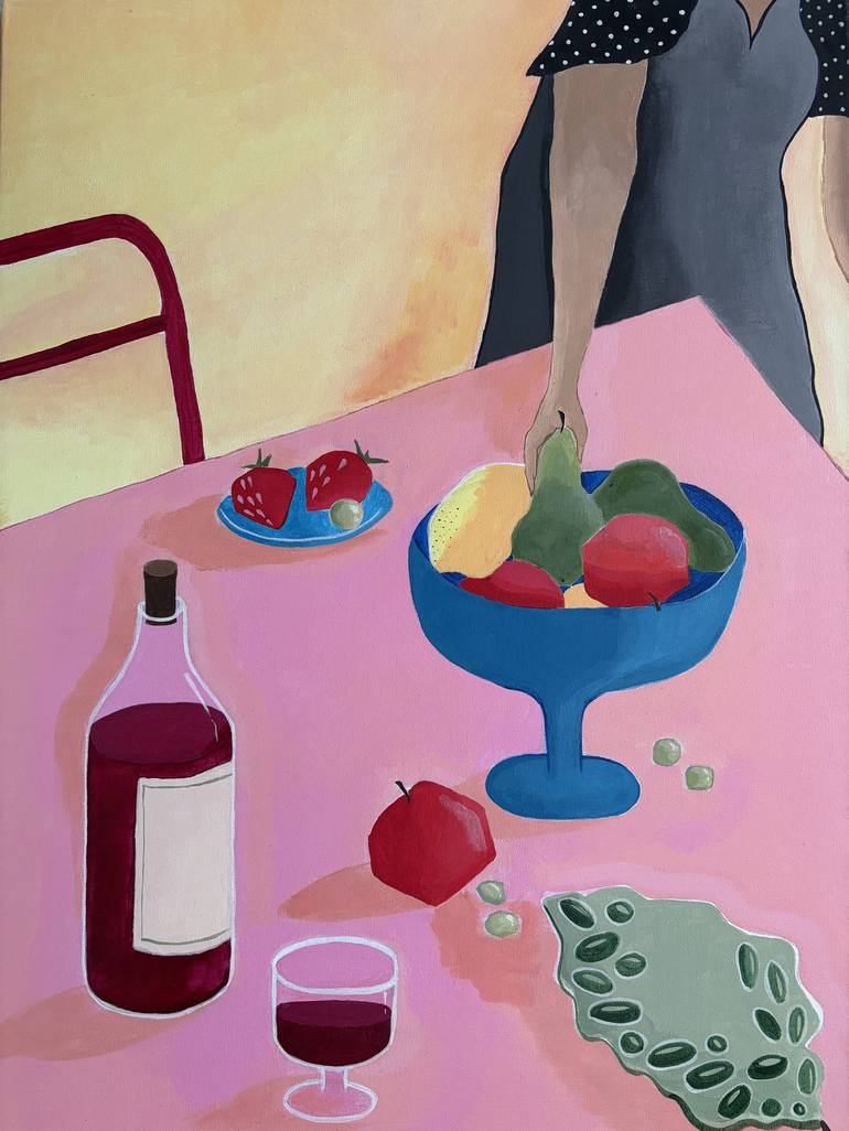 The painting is made with acrylic paints on a canvas measuring 50x70 cm. The color scheme is based on juicy, warm tones: a pale pink table, bright fruits and a rich color of wine. The composition of the painting is carefully verified, each element harmoniously complements the other. In the center o...