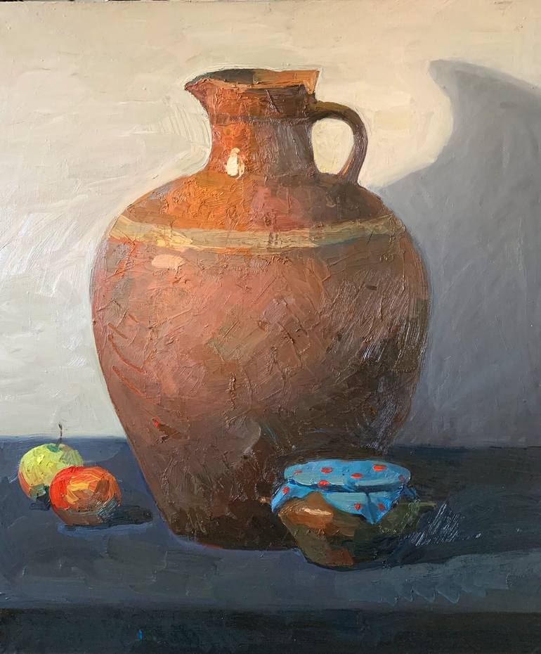 The original country still life is painted in oil from nature. Pitcher, jug and apples. Created using oil paint on gallery wrapped canvas. Signed and dated on back, includes certificate of authentication. Ships in a wood crate