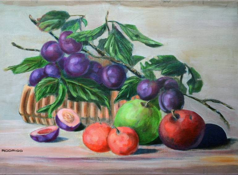I set out to create a still life painting , assembled the fruit and dish and happily achieved this result.The objective was to create a calming wall decoration for a kitchen or dining room