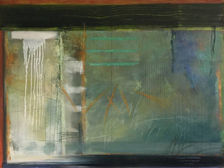 The textures in this painting are stone-like and the colors are very much like the lichen that grows naturally on rock faces. This abstract piece is intended to suggest quiet reflection in a sylvan setting.