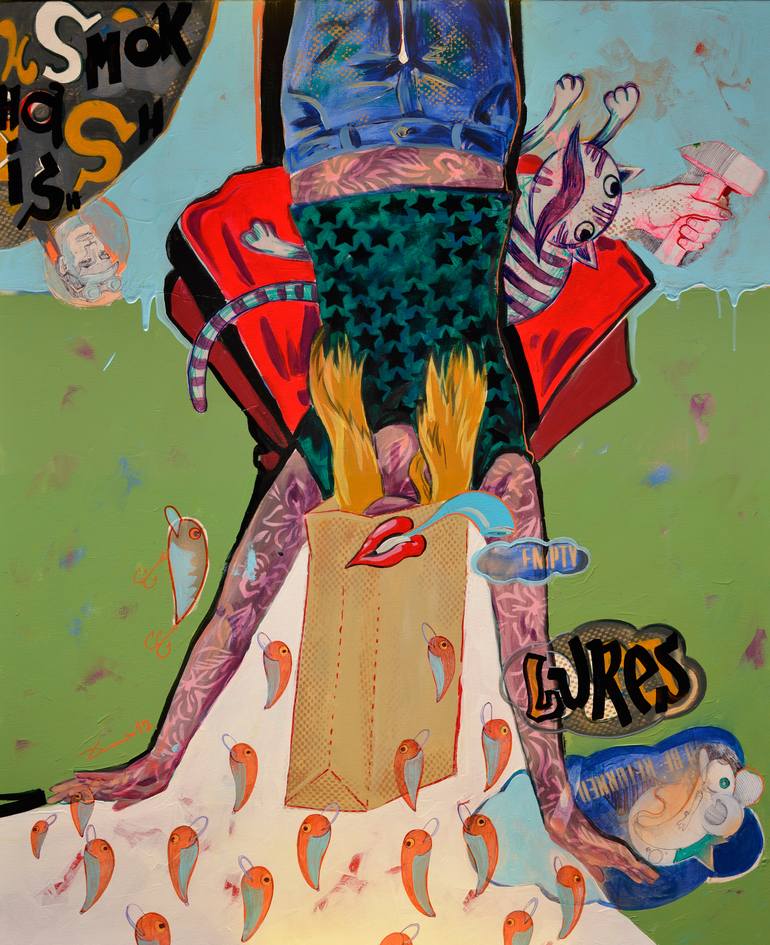 “Every time when my artworks start being liked by too many people, I change my way of expression. There is nothing more embarrassing than to receive positive reviews for a series of paintings – this is a sign for me that something is wrong and that I need a change. In this way I avoid creating my own style, something that all the artists try to do. The style of work is a step of a failure for me and also an erasure of the artist. The style makes from the artist an ordinary craftsman. I don’t like the idea of labeling: abstract art, pop art, contemporary or modern art… The contemporary visual artist must not be influenced by labels. Let’s leave that for the art critics.” Studied at the Old art school in one of the most prestigious university of arts in Bulgaria, Damyan Bumbalov does not stop to surprise the audience with his slightly scandalous or postpunk works. His art passes through the classical painting, pop art or street art and reaches fresh and aesthetic, sometimes slightly rude, synthesis of several skills. In each of his canvases the viewer can crash onto different layers of diverse creative styles. In his compositions he combines successfully graphic images with classical paintings, decorative elements with street notes, portrait images with cartoon characters, and also expressive abstract moments. This laying of textures and images defies an abstract clearness for the viewers. The contrast between light and dark, warm and cold, painting and graphics give a feeling of comfort and discomfort at the same time. The viewer is confused, but surprised, of this aesthetic bomb, which the artist throws while presenting his painting or sculpture. In this way the viewer receives a completed contemporary work. The art might be called provocative and even scandalous, but that can’t be enough. Damyan Bumbalov’s attitude to the actual and eternal topics in the human nature do not end in itself. Under the rough form and expression there are deeper messages at conscious and unconscious level. These are messages which shake every person who thinks outside the paradigm of mediocrity. Albert Levaev (art collector and curator)