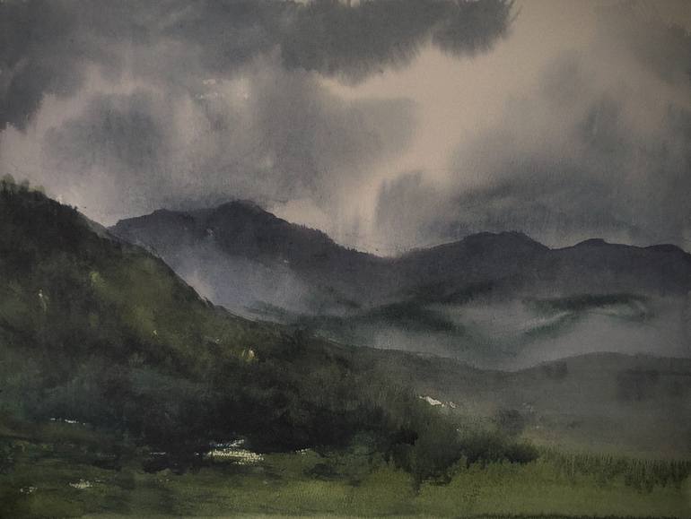 Traveling to the Alps in 2018 inspired the artist for painting the landscape "Storm in the mountains" in watercolor.