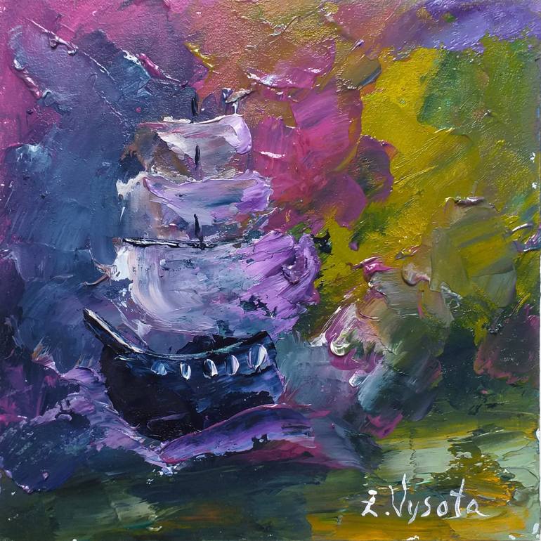 ---- Nature and its colors. Nidht, strong wind, waves flood the deck, but the ship stubbornly goes forward on a given course. ---- Unique and exclusive 100% hand-painted, Made in oil on cardboard and covered with a layer of varnish. ---- The painting is signed on the front and signed and dated o...